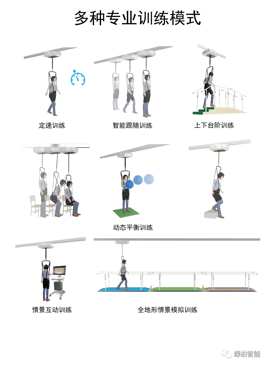 此外,系統具有智能跟隨、上下臺階和動態平衡等六種訓練模式,滿足患者的多種日常情景訓練,提高患者本體感覺輸入,實現真正獨立步行能力的恢復。